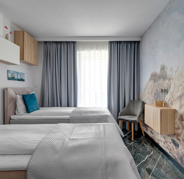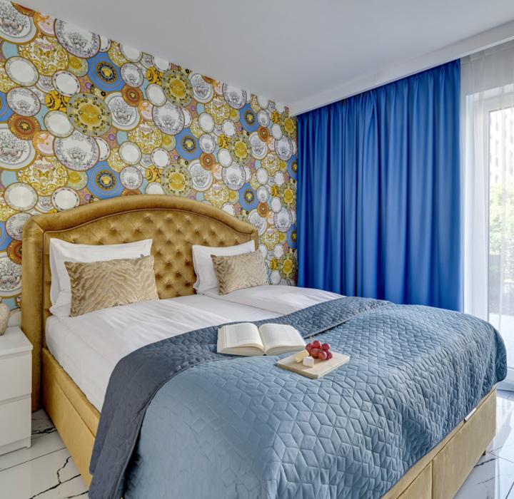 Wnętrze apartamentu łączy klasyczną elegancję z nowoczesnością. Jasne kolory, miękkie tkaniny i złote detale tworzą Przytulną atmosferę, w której łatwo się wyciszyć i poczuć jak w domu.