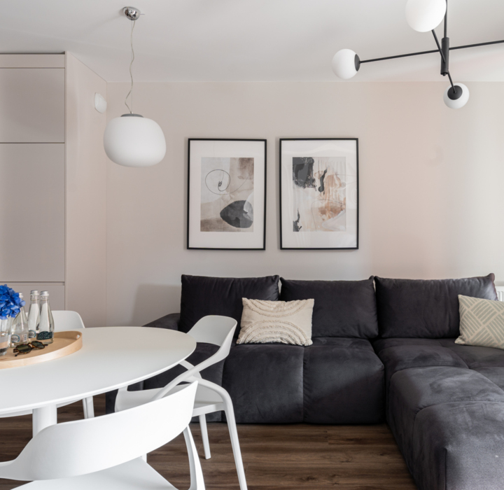 Przestronny salon z designerską sofą i stonowanymi barwami zachwyca subtelnym minimalizmem. Otwarty aneks kuchenny pozwoli przygotować ulubione śniadanie lub kolację przy lampce wina, a duże okna wpuszczają mnóstwo światła, podkreślając charakter wnętrza. W sypialni czeka wygodne łóżko małżeńskie z miękką pościelą i balkon, który staje się prywatną strefą relaksu.