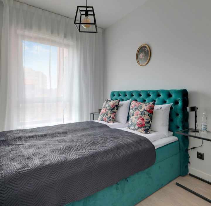 Wnętrze zostało urządzone z dbałością o detale – eleganckie oświetlenie, welurowe tkaniny i nowoczesne dodatki tworzą wyjątkową atmosferę sprzyjającą odpoczynkowi.