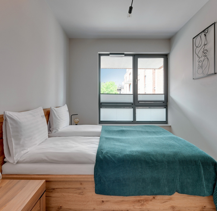 Wnętrze utrzymane w naturalnych barwach, z drewnianymi akcentami i delikatnymi dodatkami, tworzy atmosferę sprzyjającą odpoczynkowi. To przestrzeń, która łączy Nowoczesne wnętrze z przytulnym klimatem - idealna zarówno na romantyczny weekend, jak i rodzinny wypad do Gdańska.