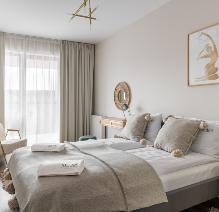 Monte Carlo to apartament, w którym każdy detal zachwyca. Jasne wnętrza, miękkie tkaniny i eleganckie dodatki tworzą atmosferę spokoju i luksusu. To miejsce, gdzie możesz naprawdę odpocząć - w samym sercu tętniącego życiem miasta.