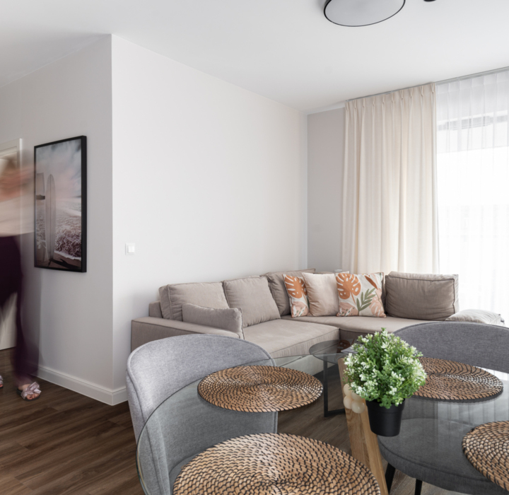 W przestronnym salonie z rozkładaną sofą można wspólnie oglądać filmy, śmiać się i planować kolejne dni. Nowoczesna kuchnia zachęca do przygotowania rodzinnych posiłków, a przy stole w jadalni nie brakuje miejsca dla wszystkich. Wieczorem czeka tu także balkon – idealny na kieliszek wina i moment wytchnienia z widokiem na Gdańsk.
