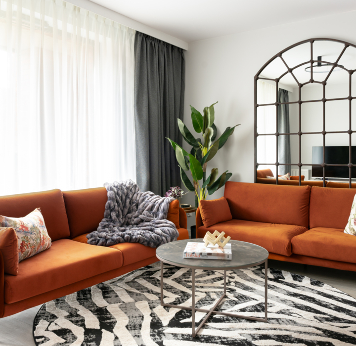 Tutaj każdy detal ma znaczenie: od miękkich, ceglastych sof po duże lustro odbijające światło wpadające przez panoramiczne okna. To miejsce, które łączy komfort domowego wnętrza z klimatem miejskiego apartamentu w centrum wydarzeń.