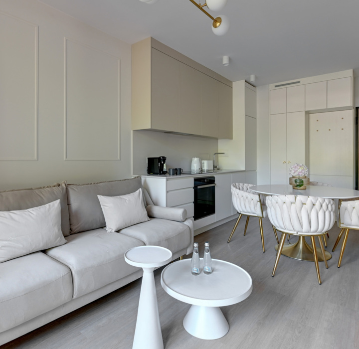 Śnieżnobiała kolorystyka, złote akcenty i subtelne oświetlenie tworzą przestrzeń, w której poczujesz się jak w luksusowym apartamencie hotelowym. W pełni wyposażona kuchnia pozwala przygotować ulubione posiłki, a komfortowe wnętrze sprzyja zarówno odpoczynkowi, jak i pracy zdalnej.