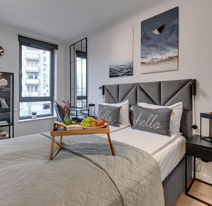Apartament Blue Modern to przestrzeń, w której nowoczesny design spotyka się z lekkością i spokojem. Subtelne barwy, światło wpadające przez duże okna i miękkie tkaniny tworzą atmosferę, w której naprawdę można odpocząć.