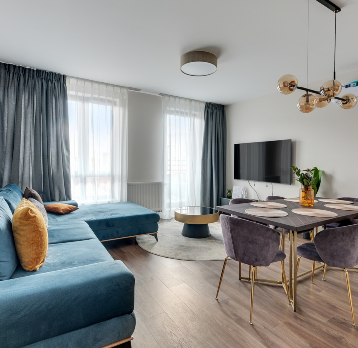 Wnętrze apartamentu łączy nowoczesność z artystycznym akcentem - głębokie zielenie, fioletowe dodatki i złote detale tworzą designerskie wnętrze o wyjątkowym charakterze. To przestrzeń, w której każdy detal został przemyślany tak, by sprzyjał relaksowi, pracy i wspólnym chwilom.