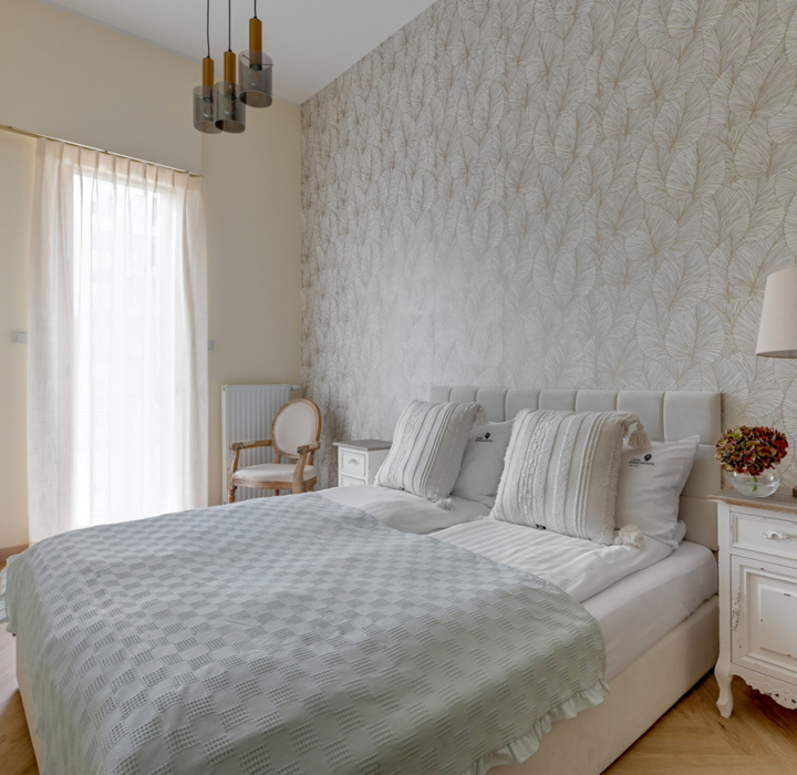 Wnętrze utrzymane w stylu prowansalskim zachwyca delikatnymi barwami i złotymi akcentami. To przestrzeń, która emanuje przytulną atmosferą i spokojem.