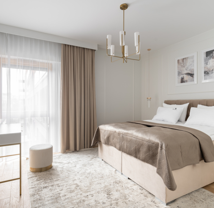 Wnętrze utrzymane w tonacji bieli, beżu i złota emanuje elegancją i spokojem, tworząc przytulną atmosferę sprzyjającą relaksowi i regeneracji.