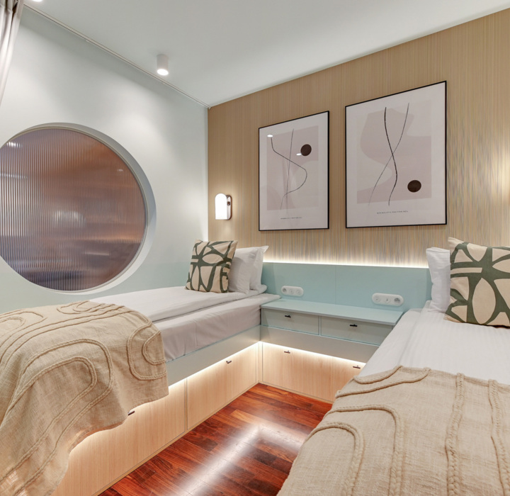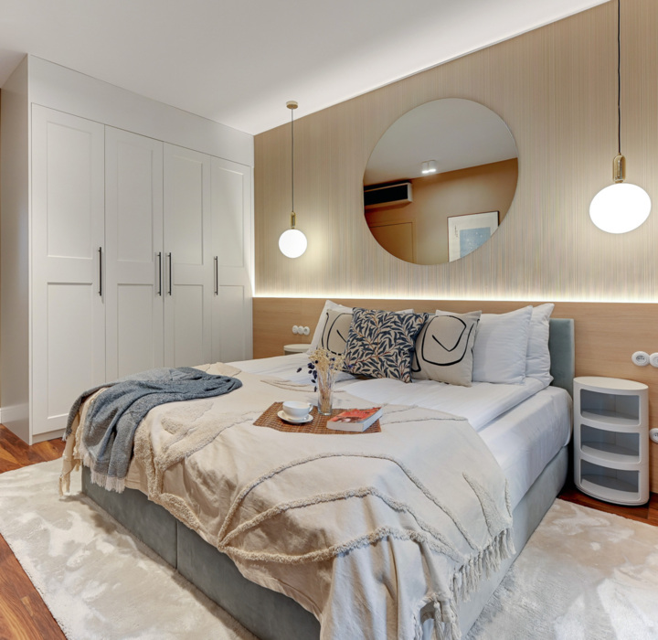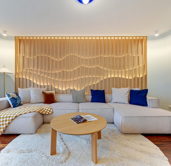 Wnętrze łączy nowoczesność z subtelnym luksusem - ciepłe drewno, miękkie tkaniny i stonowane barwy tworzą przestrzeń sprzyjającą odpoczynkowi.