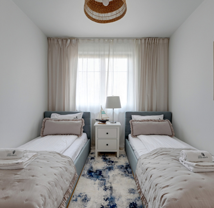Amalfi to apartament stworzony z myślą o rodzinnych wyjazdach, idealny na dłuższy pobyt nad morzem. Nowoczesne, jasne wnętrze o powierzchni 85 m² mieści trzy wygodne sypialnie, w tym jedną zaprojektowaną z miejscem do pracy zdalnej - praca i relaks w jednym towarzyszą tu codziennemu wypoczynkowi. Apartament posiada przestronny salon z balkonem i częścią jadalnianą, w pełni wyposażoną kuchnię oraz łazienkę z prysznicem.