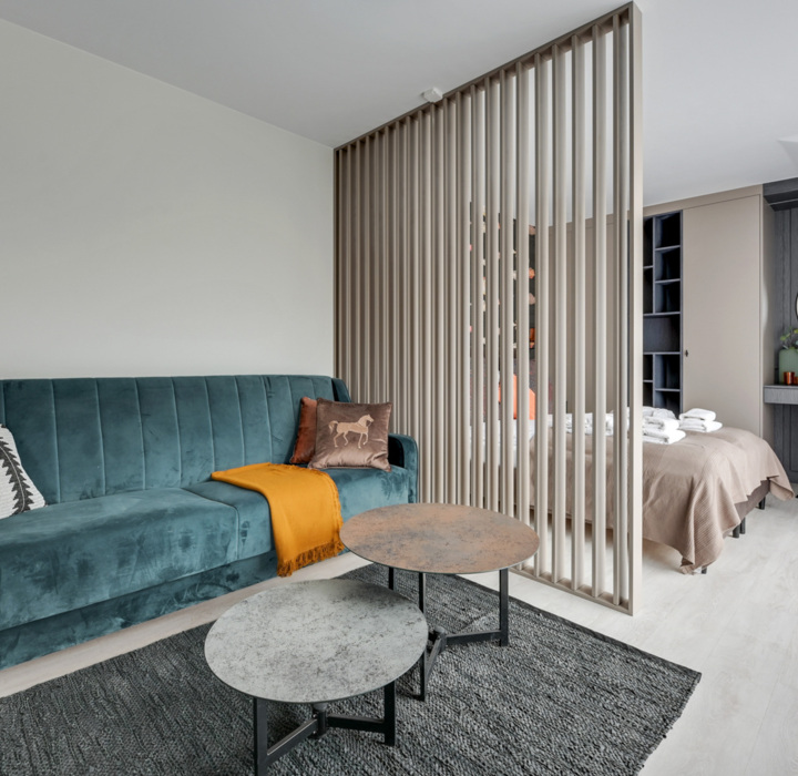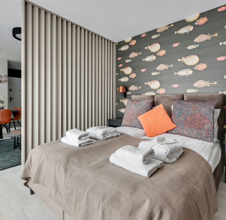Wnętrze wyróżnia się eleganckim podziałem na strefę sypialnianą i wypoczynkową, co zapewnia większą prywatność i wygodę podczas pobytu. Przestrzeń z balkonem wychodzącym na spokojne podwórze – idealnym na poranny relaks z kawą. Na gości czeka stylowa łazienka z prysznicem w standardzie hotelowym, a także dodatkowa rozkładana sofa w salonie, która może posłużyć jako miejsce noclegowe dla kolejnych dwóch osób.