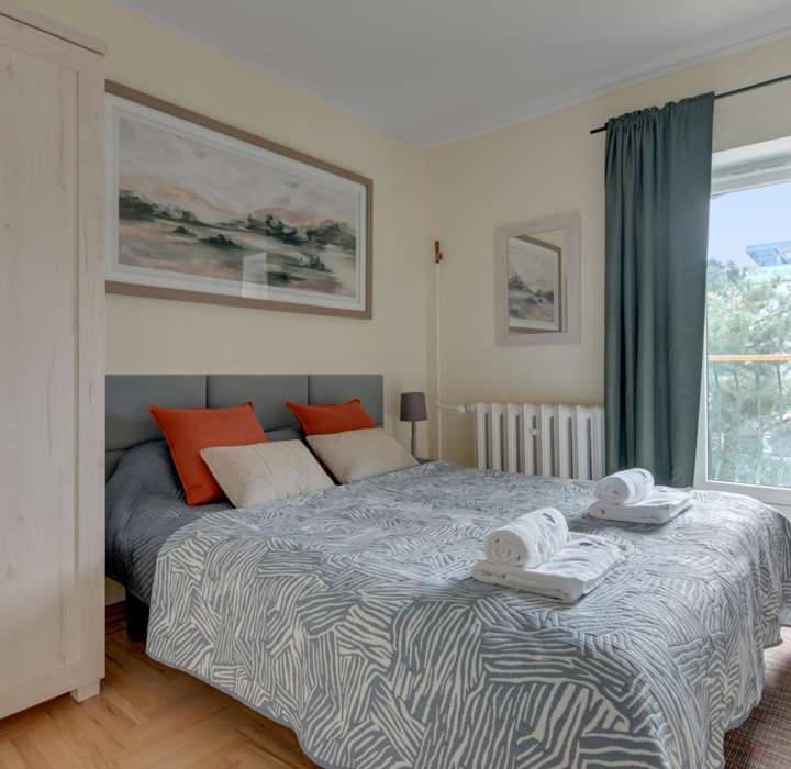 W apartamencie znajduje się oddzielna sypialnia z łóżkiem małżeńskim, jasny salon z rozkładaną sofą i TV, w pełni wyposażony aneks kuchenny, część jadalniana, łazienka z prysznicem oraz balkon – przytulna atmosfera towarzyszy podczas chwil relaksu.