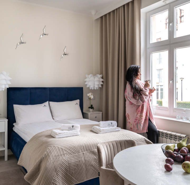 Nemo Studio 1 to idealna propozycja dla par, rodzin z dzieckiem lub grupy do 4 osób, położona na parterze sopockiej kamienicy z niezależnym wejściem, zapewniając komfort dla dwojga oraz większych grup.