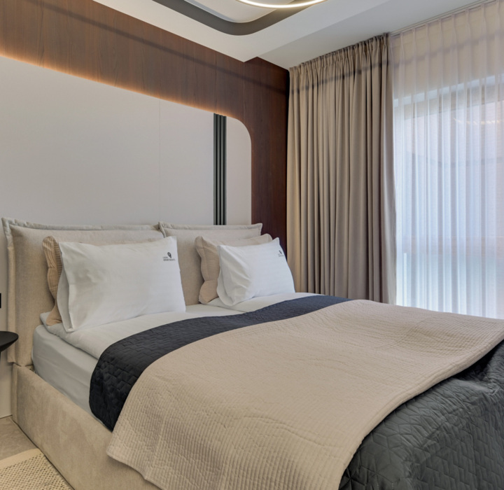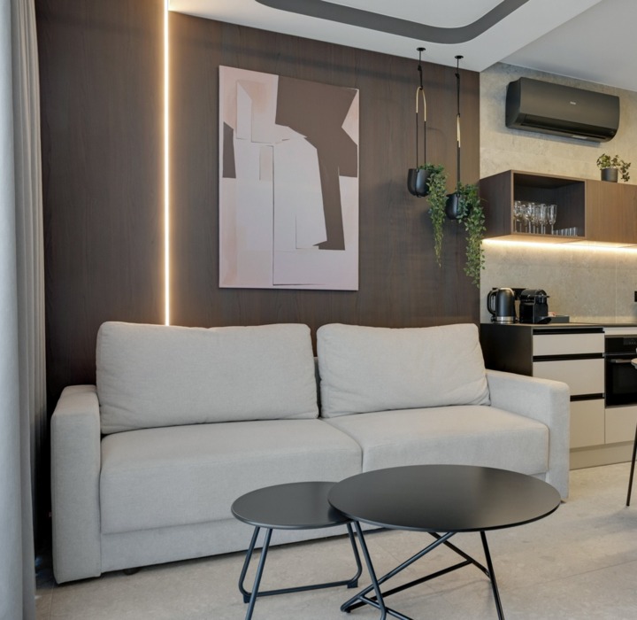 The spacious living room with a separate sleeping area gives a sense of privacy while maintaining an open, bright layout. The apartment comfortably accommodates up to 4 people, making it an ideal choice for a romantic weekend or a family stay.
