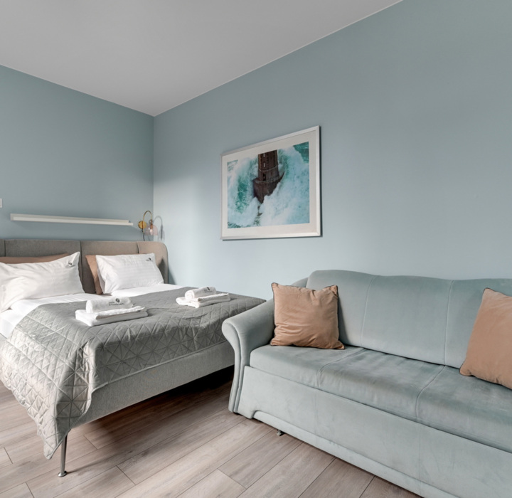 The apartment is on the second floor of a tenement house (no elevator) and offers a large double bed and a sofa bed in the open space living room, which can serve as an additional sleeping place. This ensures full comfort for two, both for short and longer stays.