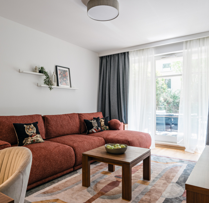 An apartment located in a trendy, gated estate in a quiet area – ideal for families with children. Comfortably accommodates up to 6 people – offers two bedrooms (the main one with a double bed, the second with a sofa bed and a workspace), a spacious living room with a terrace and a large sofa bed, a dining area, and a fully equipped kitchenette.